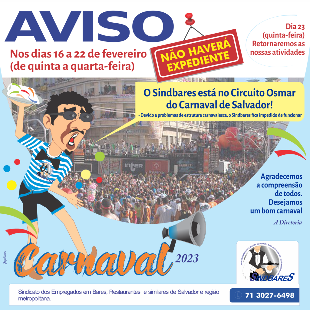 Devido o Sindbares ficar localizado próximo a Rua Carlos Gomes um dos circuitos do Carnaval, (o Circuito Osmar). Passam diariamente por esta região alguns dos inúmeros blocos, cordões e outros grupos já acompanhados de foliões que vão ao Palanque montado na Praça do Campo Grande para sua apresentação. No percurso de volta fazem este mesmo roteiro, só que desta vez indo até as proximidades do largo dos Aflitos, onde ocorre a dispersão da maioria destes blocos. Diante dos problemas que o circuito gera, a exemplo de locomoção (redução de transporte), alguns locais fechados, instalação de bares e barracas nos arredores do nosso sindicato. Pensando nestas dificuldades e os perigos que isto possa oferecer para os nossos sindicalizados e colaboradores no seu trajeto até aqui. Achamos que seria mais sensato mantê-lo fechado durante todo o período carnavalesco.