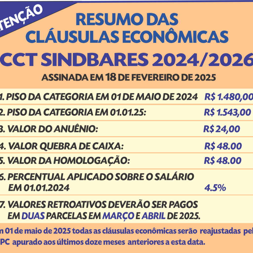 Após uma série exaustiva de reuniões entre o Sindbares e representantes do sindicato patronal, finalmente foi possível chegar a um consenso, e a Convenção Coletiva de Trabalho (CCT 2024/2026) foi assinada.