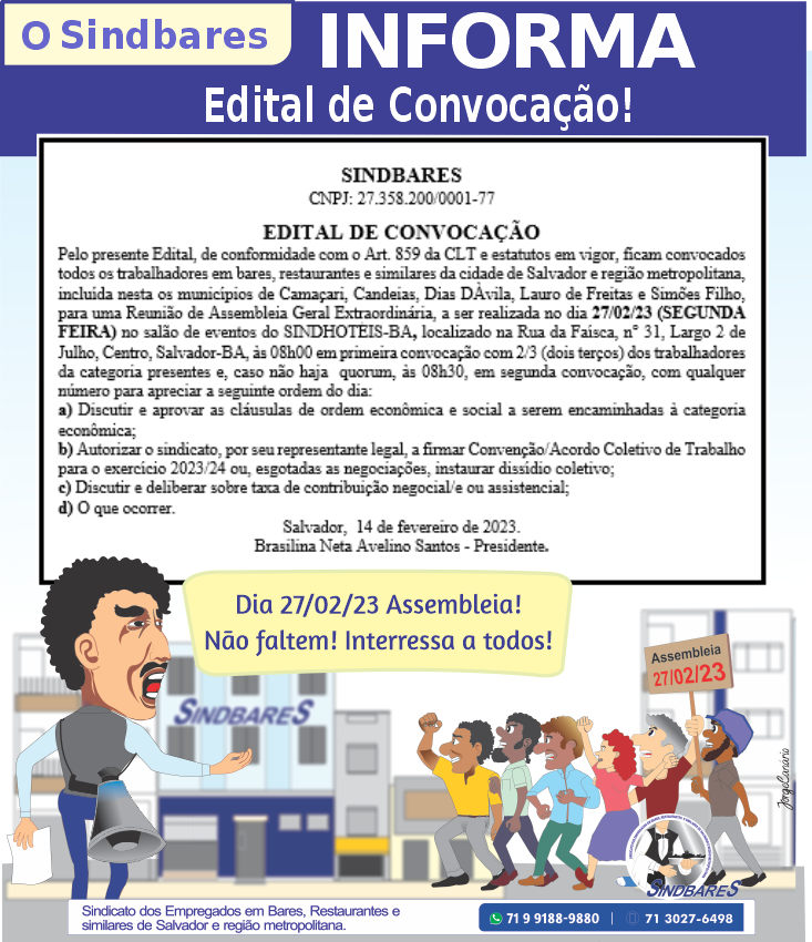 Ocorrerá nesta segunda -feira próxima, 27/02, na sede do Sindbares, Rua da Faísca 31 – Centro, uma reunião de Assembleia Geral para discutir assuntos de interresse da Categoria. Não faltem!